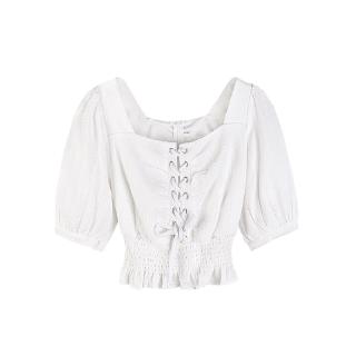 Váy trắng tay bồng cổ vuông dáng ngắn chun ngực