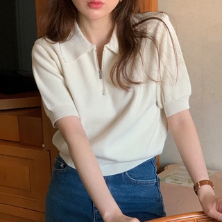 【Hana and Alice】Áo Thun Dệt Kim Tay Ngắn Cổ POLO Có Khóa Kéo Dễ Phối Đồ