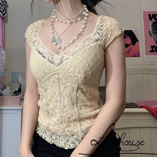 Áo thun tay ngắn cổ chữ V phối ren thời trang xuân hè cho nữ
