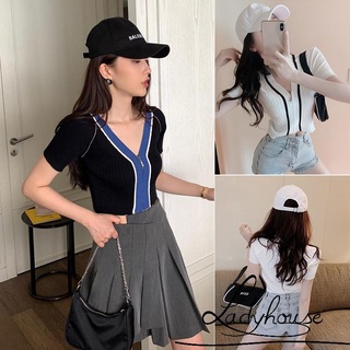 Áo Croptop Dệt Kim Tay Ngắn Cổ Chữ V Màu Sắc Tương Phản Có Khóa Kéo Thời Trang Mùa Hè Cho Nữ
