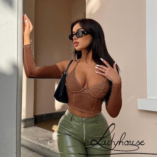 Áo Croptop Tay Dài Cổ Chữ V Màu Sắc Thời Trang Cho Nữ