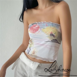 Áo Croptop Không Tay Hở Lưng Phối Lưới In Họa Tiết Dễ Thương Y2K Cho Nữ