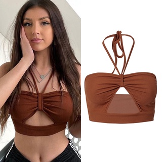 Áo yếm croptop dệt kim không tay phối nếp gấp thiết kế khoét lỗ thời trang quyến rũ cho nữ
