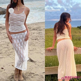 Bộ Trang Phục 2 Mảnh Áo Hai Dây Phối Ren Hoa 3D + Chân Váy Dài Xuyên Thấu Thời Trang Mùa Hè Cho Nữ