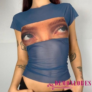 Áo Thun Crop Top Phối Lưới In Hình Đôi Mắt Quỷ Phong Cách Harajuku Vintage Thời Trang 2000s y2k