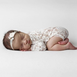 Bộ Áo Liền Quần Tay Dài Phối Ren Thân Thiện Với Da Kèm Băng Đô Dùng Chụp Ảnh Cho Bé Sơ Sinh