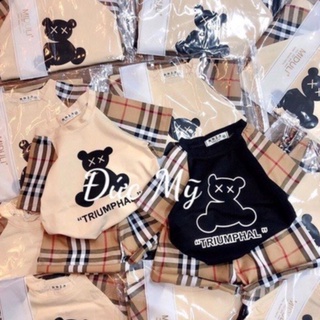 BỘ BA LỖ 2 CHÚ GẤU VUI NHỘN VIỀN MÀU QUẦN KẺ XINH XẮN CHO BÉ trai bé gái