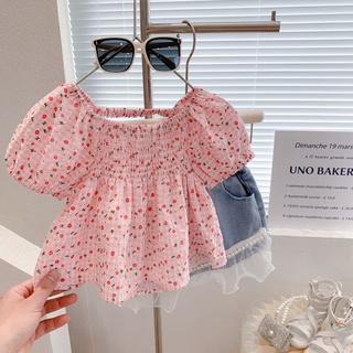Áo thun tay ngắn phồng in hoạt hình dâu tây kiểu Hàn Quốc thời trang mùa hè cho bé gái