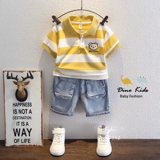 Bộ quần áo cộc tay bé trai, Sét áo polo kẻ to họa tiết gấu MARIO kèm quần bò ngố cho bé size 10-32kg