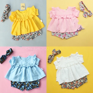 Bộ hè bé gái, bộ đũi ngực viền bèo quần thô hoa nhí kèm turban cho bé