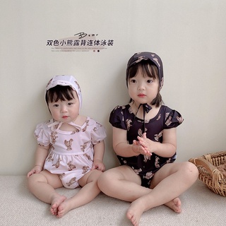 Bộ Đồ Bơi Liền Thân Tay Ngắn In Hình Gấu + Nón Thời Trang Mùa Hè Cho Bé