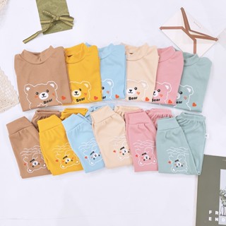 Bộ len gân cổ lọ 3cm len dài tay hình thêu mặt gấu cho bé