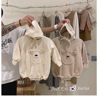Bộ đồ áo liền quần cho bé trai và bé gái dài tay họa tiết gấu có mũ 0-24 tháng