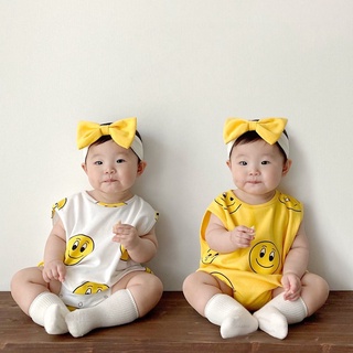 Bộ áo liền quần in hình mặt cười + băng đô thời trang mùa hè thời trang cho bé 0-24 tháng tuổi
