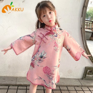 Đầm Sườn Xám Tay Dài Phong Cách Trung Hoa Thời Trang Xuân Thu Cho Bé Gái AKKU