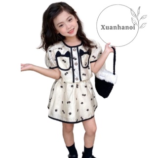 Váy bé gái hoa mai đen trắng túi nơ ngực gồm áo croptop và chân váy liên quần XHN980