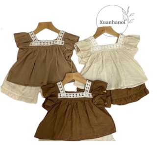 Bộ bé gái chất đũi cổ ren vuông trắng tay cánh tiên XHN921
