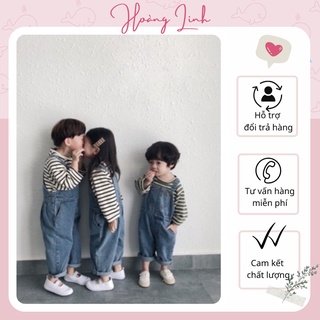 Quần yếm jeans hai dây dáng dài cho bé gái bé trai màu xanh phối viền line form rộng Y010