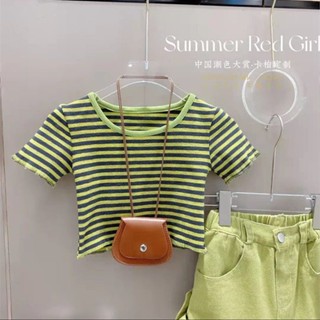 Hàng Mới Về Set Áo Thun Ngắn Tay + Quần Dài Ống Rộng Họa Tiết Sọc Thời Trang Cho Bé Gái