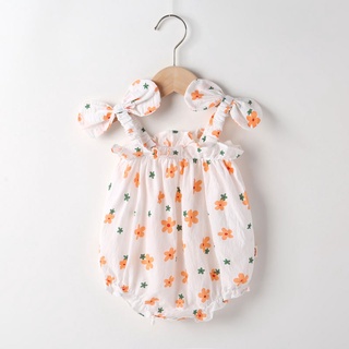 Set Đồ Mùa Hè 2 Món Gồm Áo Liền Quần Cotton Sát Nách In Hoa + Băng Cài Đầu Cho Bé Gái 0-2 Tuổi