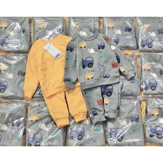 Set 2 bộ nỉ da cá hoạ tiết oto màu vàng ghi cho bé trai size từ 10-22 cân