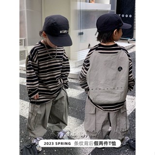 Áo Sơ Mi Giả Hai Mảnh Tay Dài Kẻ Sọc Màu Xám Cà Phê Phong Cách Hàn Quốc Thời Trang Mùa Xuân 2023 Cho Bé Trai