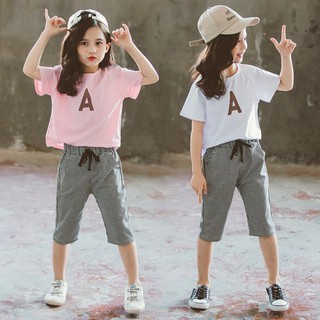 Set áo thun ngắn tay in chữ + Quần short caro cho bé gái
