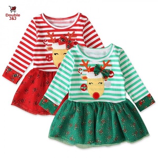 Đầm Tay Dài Phối Ren Lưới Họa Tiết Kẻ Sọc Phong Cách Giáng Sinh Cho Bé Gái 0-8 Tuổi