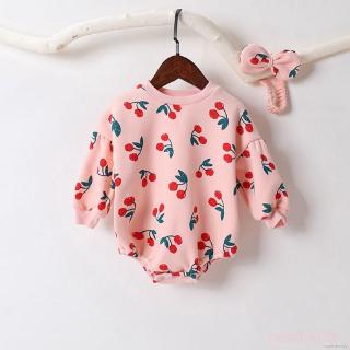 Áo liền quần tay dài in hình quả cherry và băng đô quấn đầu cho bé gái sơ sinh