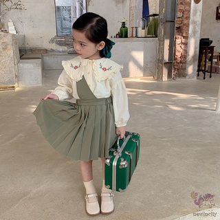 Set áo sơ mi tay dài thêu họa tiết + đầm yếm thời trang cho bé gái