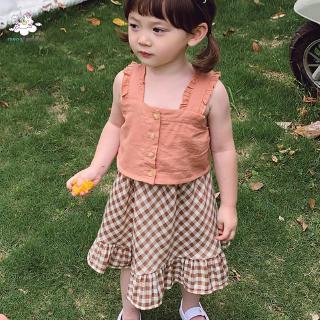 Bộ gồm áo hai dây phối bèo và chân váy họa tiết ca rô xinh xắn cho bé gái
