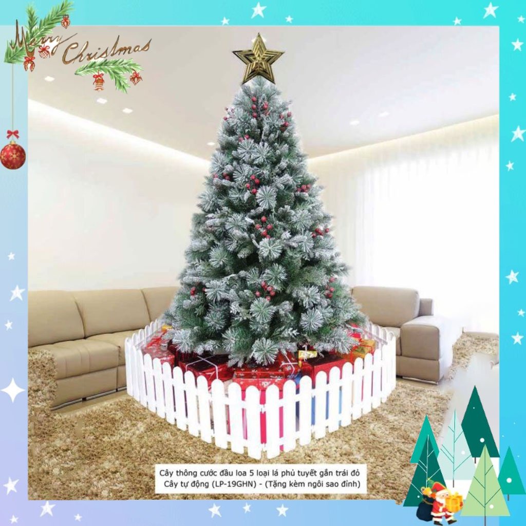 Giới thiệu Cây thông noel phủ tuyết 2m4, cây thông noel cước đầu loa 5 loại lá gắn trái đỏ tán lá dày trang trí giáng sinh