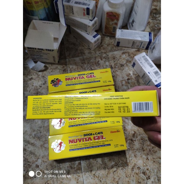 NUVITA Gel là thức ăn bổ sung vitamin khoáng cho chó, mèo. NUVITA GEL chứa các vitamin và khoáng chất vi lượng giúp điều hòa và tăng chuyển hóa hấp thụ dưỡng chất, thức ăn trong các trường hợp suy nhược mệt mỏi nói giảm sức đề kháng chậm hồi phục sau khi ốm xem công thức của sản phẩm được xây dựng dựa trên các vitamin thiết yếu a d e và Vitamin nhóm b kết hợp với khoáng chất tự nhiên. Ngoài tác dụng như là một chất dinh dưỡng cần thiết cho sinh trưởng và phát triển cơ thể để còn giúp chó mèo tăng sức đề kháng khỏe mạnh ảnh Nuvita gel được sử dụng trong các trường hợp sau: Trong thời gian mang thai hoặc nuôi con giúp thai phát triển tốt sữa nhiều. Trong thời gian luyện tập thi đấu giúp chó khỏe mạnh tăng sức chịu đựng và hoạt động Sau khi phẫu thuật cho một đợt điều trị giúp vật nuôi mau hồi phục Cách dùng cho ăn trực tiếp hoặc trộn với thức ăn liều lượng như sau 1 đến 2 muỗng cà phê trên 5 kg thể trọng. Trường hợp chó mèo mèo biếng ăn suy nhược 2 đến 4 muỗng cà phê trên 5 kg thể trọng Chú ý Để tập ăn trước tiên Cho một lượng nhỏ Nuvita gel vào miệng cho chó mèo nhằm kích thích vị giác khi vật nuôi đã quen cho ăn theo liều chỉ định đối với con vật khó khăn ăn có thể bôi trực tiếp lên miệng cho vật nuôi liếm Không dùng cho chó mèo béo phì Bảo quản nơi khô ráo thoáng mát dưới 30 độ tránh ánh nắng và ẩm Sản phẩm của công ty y cổ phần sản xuất kinh doanh vật tư và thuốc thú y. Số 7 đường 30 Tháng 4 quận Ninh Kiều thành phố Cần Thơ Sản xuất tại công ty trách nhiệm hữu hạn một thành viên thuốc thú y và chế phẩm sinh học vemedim khu công nghiệp sông Hậu xã Đông Phú huyện Châu Thành tỉnh Hậu Giang Quy cách đóng gói cái hộp 120g Ngày sản xuất in trên bao bì Hạn sử dụng hai năm kể từ ngày sản xuất