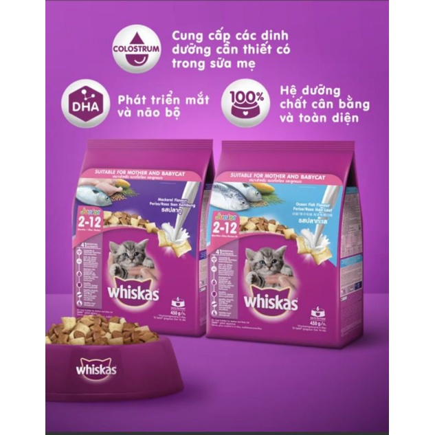 Whiskas® Junior đáp ứng nhu cầu dinh dưỡng cần thiết cho mèo con. Với 100% hệ dưỡng chất cân bằng và toàn diện, bổ sung Colostrum cùng DHA giúp bé yêu luôn vui khỏe như có mèo mẹ cạnh bên Thức ăn bổ dưỡng giúp mèo con có một khởi đầu hoàn hảo. Whiskas® Junior MỚI được bổ sung DHA và colostrum đảm bảo 100% hệ dưỡng chất cân bằng và toàn diện trong từng khẩu phần ăn. Chọn mua một bịch cho Boss yêu của bạn ngay hôm nay! Lấy lòng mèo yêu thật dễ! Chỉ cần cho mèo thưởng thức món ngon mới và cải tiến từ Whiskas® Dry Junior - Dinh dưỡng cân bằng và hoàn thiện 100%. Bổ sung thêm Colostrum từ sữa mèo mẹ & DHA tăng cường thị giác và não bộ trong từng viên thức ăn nhân sữa thơm ngon, hỗ trợ mèo phát triển khoẻ mạnh. 🐱 Whiskas Junior 450g Thức ặn hạt phù hợp cho mèo con, mèo bầu, mèo mẹ nuôi con. Với dinh dưỡng tối ưu đáp ứng tất cả các nhu cầu của bé mèo nhà bạn!!! Hướng dẫn sử dụng: Cho ăn trực tiếp theo hướng dẫn trên bao bì hoặc theo nhu cầu thực tế của mèo Bảo quản nơi khô ráo thoáng mát, đậy kín khi mở bao bì Ngày sản xuất, hạn sử dụng in trên bao bì: Hạn 18 tháng Xuất xứ: Thái Lan Nhà sản xuất: Mars Petcare Company Limited, Thailand. Nhập khẩu và chịu trách nhiệm sản phẩm: Công ty tnhh Mars Petcare Việt Nam. Số 161 Đường Đồng Khởi, P Bến Nghé, Q1 Tp Hồ Chí Minh Quy cách đóng gói: 450g