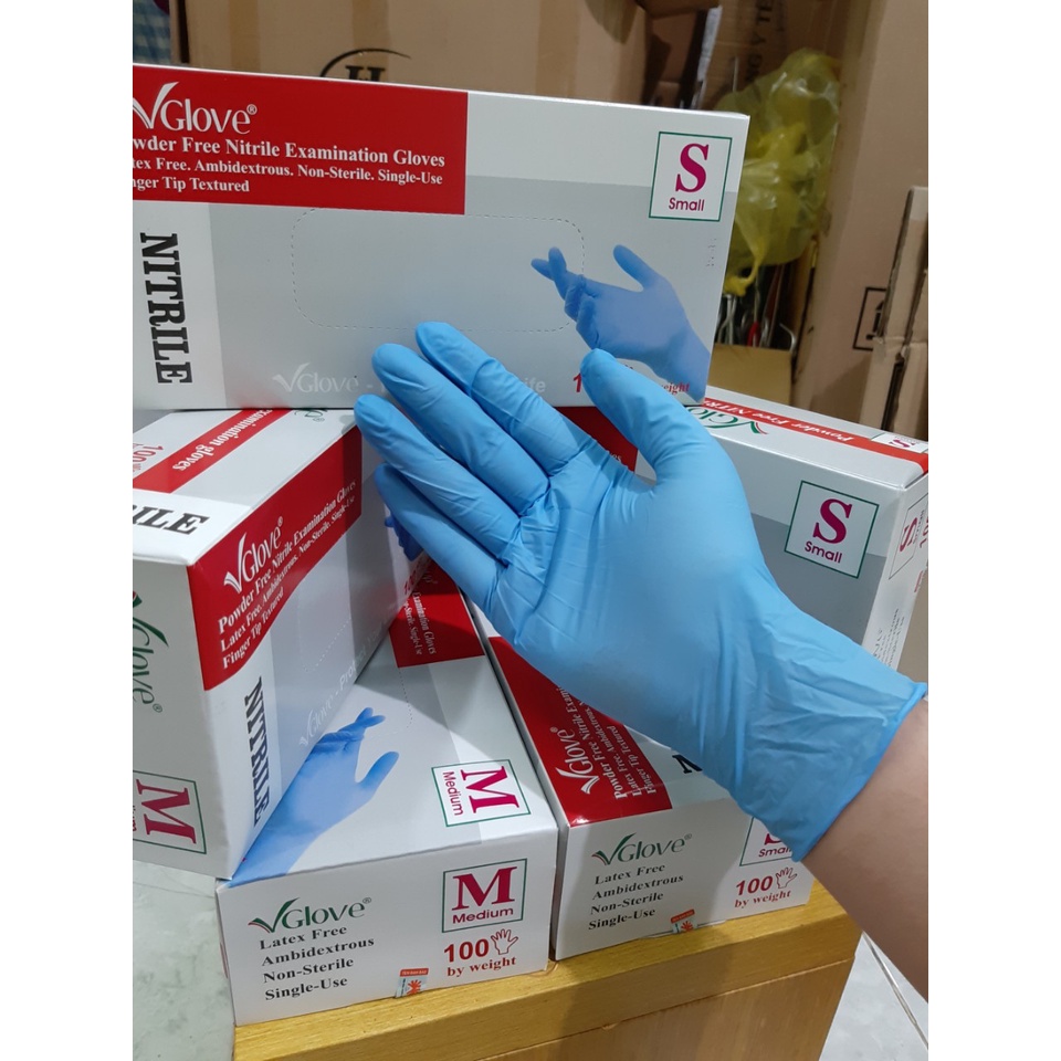 Sức Khỏe > Vật tư y tế > Bao tay và khẩu trang y tế > Thùng 10 hộp Găng tay y tế Nitrile Vglove 4.0 - không bột màu xanh- HÀNG SẴN- Hộp 100 chiếc Size S M L