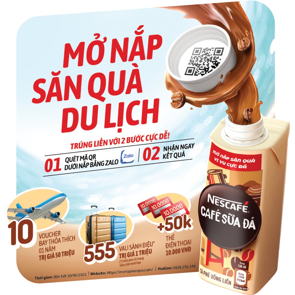 NESCAFE CAFE SỮA ĐÁ PHIÊN BẢN KHUYẾN MẠI QUÉT MÃ SĂN QUÀ DU LỊCH - NESCAFE CAFE Sữa Đá ""Gấp đôi cà phê - Gấp đôi sữa"", đậm ngon bất biến tới ngụm cuối cùng nay đã có thêm diện mạo mới với chương trình khuyến mãi Quét Mã Săn Quà Du Lịch. - Chỉ cần mở nắp, quét mã bằng Zalo, bạn đã có ngay cơ hội trúng voucher máy bay trị giá 50 triệu đồng và hàng ngàn giải thưởng hấp dẫn khác chỉ trong tíc tắc. Thông tin chi tiết xem tại https://monapsanqua.com/. Tham gia ngay!