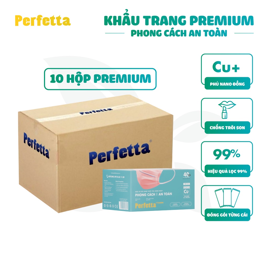 Khẩu trang Perfetta Premium là dòng khẩu trang hoàn toàn mới của thương hiệu Perfetta Với điểm nổi bật thanh kẽm giữa giữ không cho khẩu trang ít tiếp xúc da kèm lớp lọc là lớp vải không dệt phủ nano đồng gấp đôi tính năng bảo vệ loc bụi kháng khuẩn bảo vệ sức khỏe toàn diện. Lớp ngoài: Vải không dệt Polypropylene tổng hợp được bao phủ bởi bộ lọc vi khuẩn Nano-Cu Lớp giữa: Vải lọc không dệt kháng khuẩn lọc bụi mịn. Lớp trong: Vải không dệt kháng khuẩn Thanh nẹp mũi giúp ôm khít khuôn mặt Dây đeo bản lớn mềm mại Thanh miệng giữa khẩu trang giúp dễ dàng nói chuyện Màu sắc: Số lượng: 40 cái/hộp , 50 hộp/thùng Xuất xứ: Việt Nam Nhà sản xuất: Phú Bảo Medical KHẨU TRANG ĐƯỢC NIÊM PHONG TỪNG CÁI