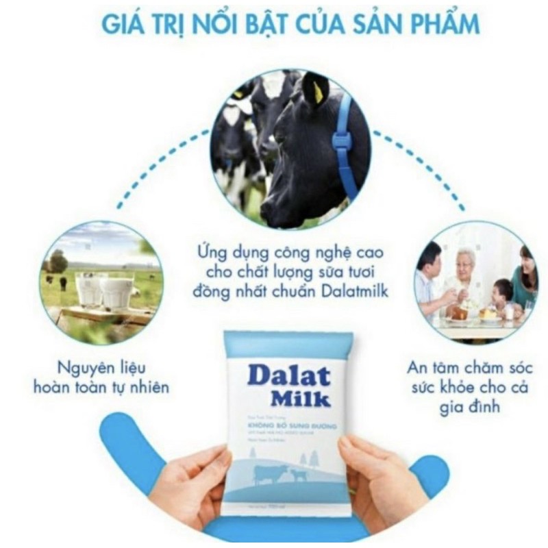 Thừa kế toàn vẹn giá trị của thương hiệu Dalatmilk lâu đời, được yêu mến bởi chất lượng vượt trội, sữa tươi tiệt trùng bịch giấy mới theo chuẩn Dalatmilk sử dụng nguyên liệu hoàn toàn tự nhiên là sữa tươi sạch của vùng chăn nuôi bò sữa nổi tiếng. Sản phẩm nói “không” với các chất bảo quản hay nguyên liệu tổng hợp. Nếu như trước đây, những khách hàng yêu mến thương hiệu Dalatmilk mới chỉ có lựa chọn là sữa tươi thanh trùng và các loại sữa chua ăn, sữa chua uống hoàn toàn từ sữa tươi cao nguyên. Tuy nhiên, do sữa tươi thanh trùng và sữa chua đều là những sản phẩm có hạn sử dụng ngắn nên có những hạn chế nhất định trong việc bảo quản, từ đó dẫn đến hạn chế tiếp cận lượng khách hàng lớn. Bởi vậy, việc Dalatmilk vừa ra mắt Sữa tươi tiệt trùng đã đáp ứng sự mong mỏi của đông đảo người tiêu dùng, đặc biệt khi Dalatmilk lựa chọn bao bì bịch giấy 220ml - khách hàng có thêm một lựa chọn sản phẩm sữa tươi rất chất lượng mà cũng vô cùng tiện lợi, giá thành hợp lý. Hạn sử dụng 6 tháng Kể từ ngày Sản Xuất Phù hợp với cả gia đình và trẻ em từ 1 tuổi trở lên Bao bì giấy tiệt trùng của Dalatmilk đạt chuẩn quốc tế Tetra Pak (Thụy Sỹ) với công nghệ chiết rót vô trùng, đảm bảo chất lượng tươi ngon, bổ dưỡng trong suốt thời gian sử dụng của sản phẩm.