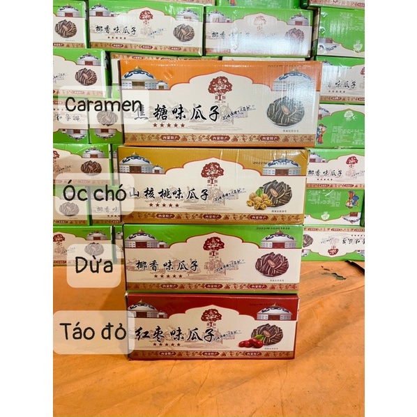 Hướng dương tẩm vị hạt mẩy, to đều hạt. 1 thùng 5kg Có 5 vị: caramen, táo đỏ, óc chó, dừa, ngũ vị hương. Caramen và táo đỏ, dừa tẩm vị ngọt Óc chó tầm vị mặn ngọt Ngũ vị tẩm vị mặn mùi ngũ vị hương.