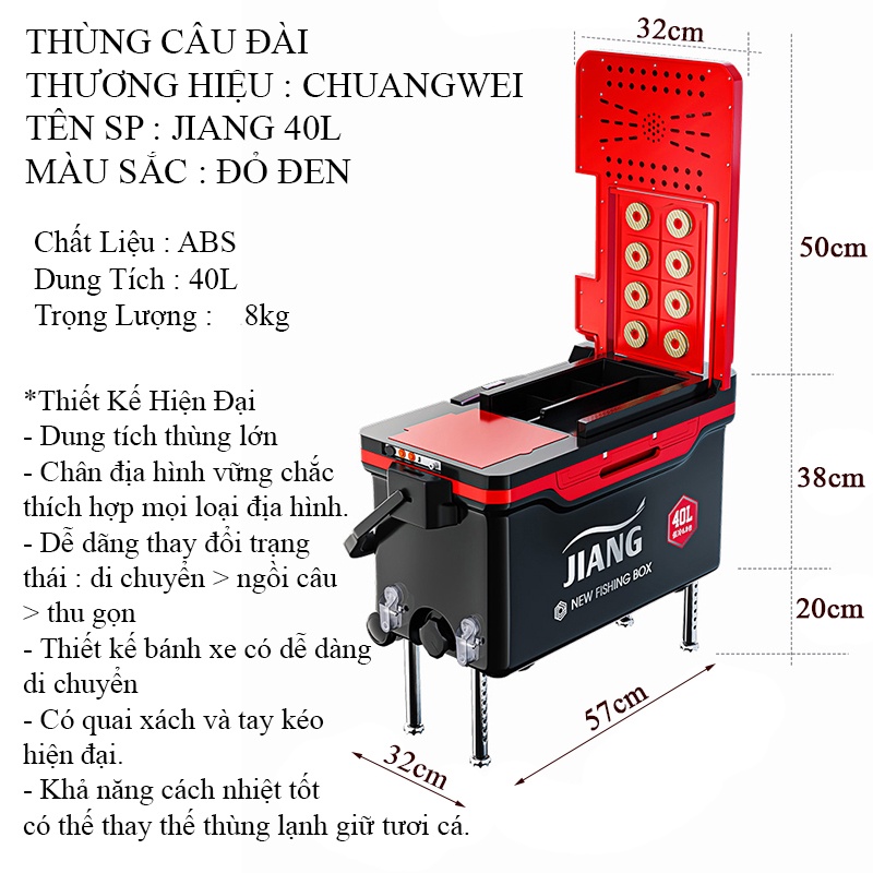 Thùng Câu Đài Thương Hiệu : ChuangWei Tên Sản Phẩm / Model : JIANG 40L Màu sắc : Đen Đỏ Chất Liệu : ABS Dung Tích : 40L