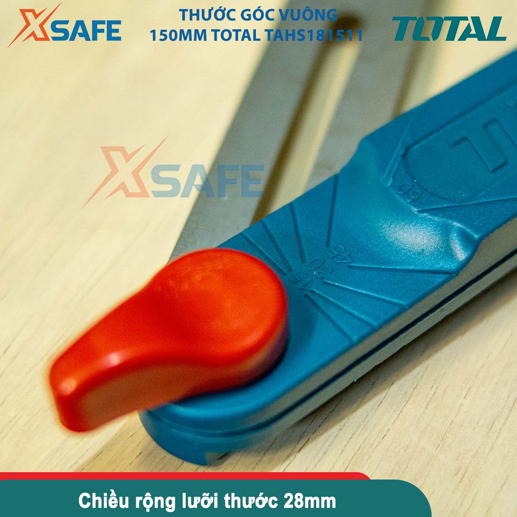 Giới thiệu Thước góc vuông 150mm TOTAL TAHS181511, có mực nước thủy, chiều rộng lưỡi thước 28mm, đánh dấu góc chính xác