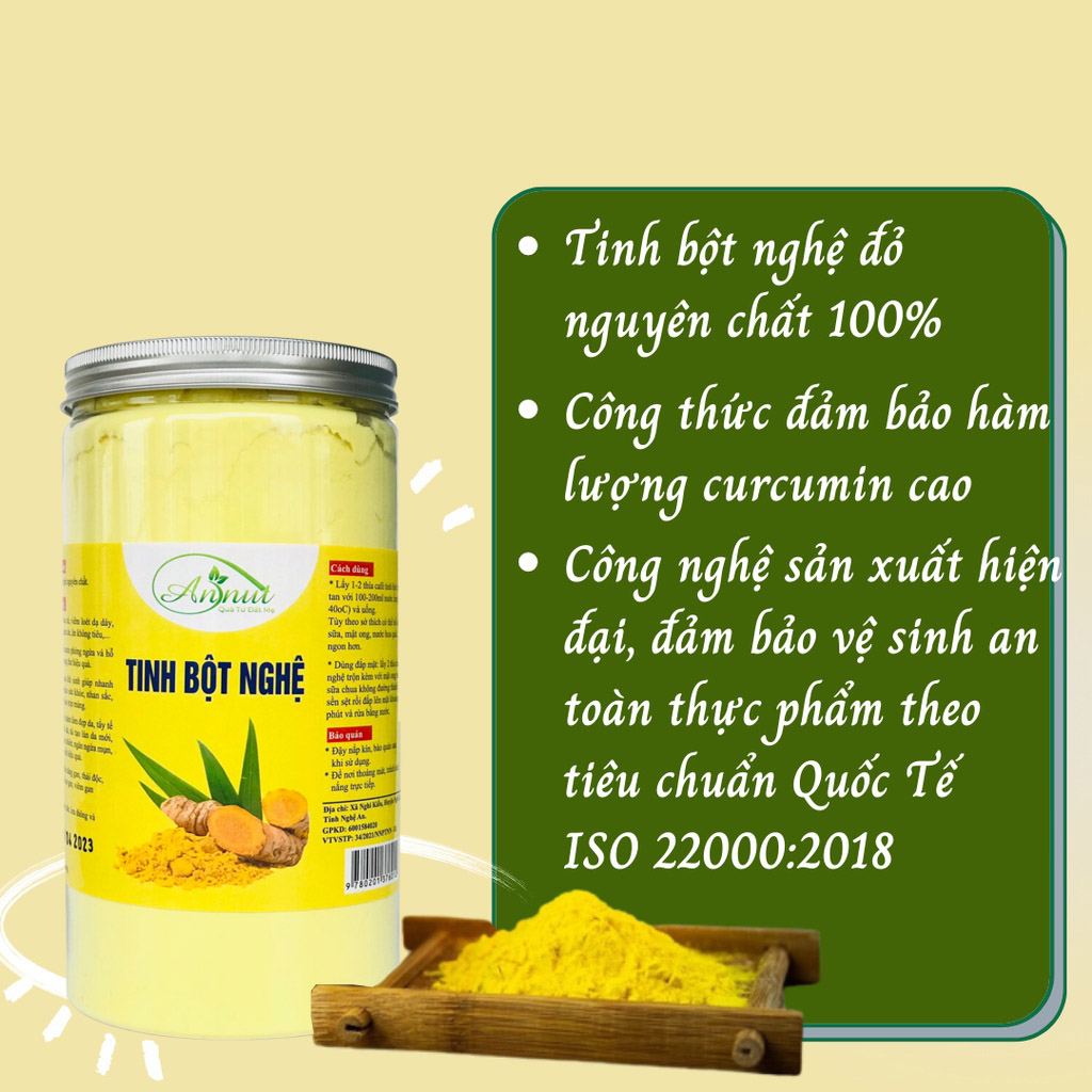 * Mô tả sản phẩm tinh bột nghệ đỏ nguyên chất ANNUT: - Tinh bột nghệ đỏ là thành phẩm từ củ nghệ tươi, sau khi trải qua quá trình tách lọc, loại bỏ tạp chất, thì đem xay nhuyễn thành bột. Sau đó nghệ được lắng đọng, chưng cất và tách tinh dầu nhiều lần thì sẽ thu được tinh bột nghệ nguyên chất, đảm bảo có chứa hàm lượng curcumin cao. Sau khi đem sấy khô, tinh bột nghệ đỏ sẽ có dạng cục, tiếp đến là nghiền mịn chúng nhiều lần để thu được tinh bột nghệ thật mịn và nhuyễn. - Nghệ đỏ là loại củ có màu vàng cam, tuy nhiên, khi tinh chế thành tinh bột nghệ nó sẽ có màu vàng đậm, bột cưc mịn không vón cục. mùi thơm của nghệ không nồng như nghệ tươi, có vị nghệ nhẹ. - So với tinh bột nghệ vàng thì tinh bột nghệ đỏ có hàm lượng curcumin cao hơn gấp 4 lần. Cứ 1kg tinh bột nghệ đỏ phải cần đến 23-25kg nghệ đỏ tươi, trong khi đó 1kg tinh bột nghệ vàng chỉ cần 10-20kg nghệ vàng tươi. Chính vì thế, giá thành tinh bột nghệ đỏ thường cao hơn tinh bột nghệ vàng.