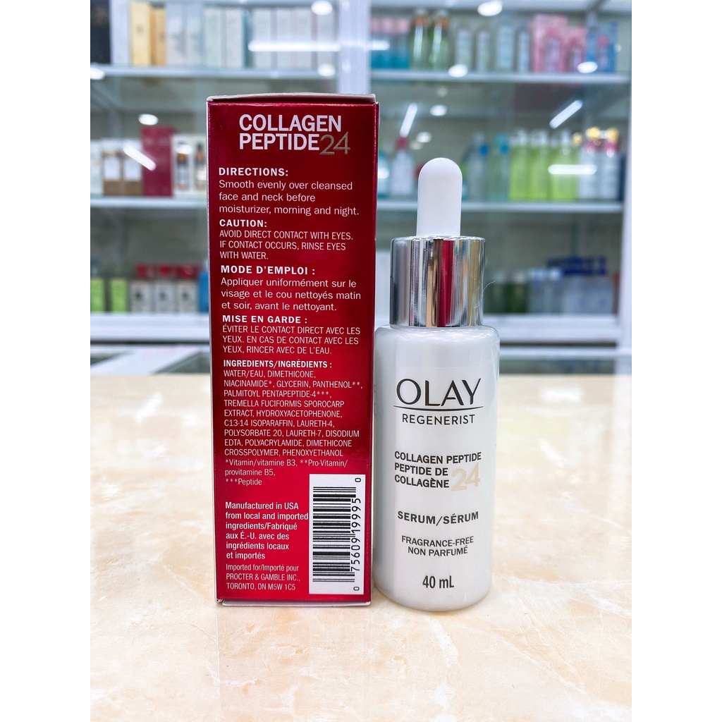 - Tinh chất chống lão hóa Olay Regenerist Collagen Peptide 24 Serum hấp thụ nhanh chóng, cho bạn ngậm nước suốt 24 giờ mà không gây cảm giác nhờn dính. - Serum Collagen Peptide 24 được pha chế đặc biệt với các thành phần đã được kiểm chứng về hiệu quả như Collagen Peptide 24 và Vitamin B3 +, để biến đổi diện mạo làn da của bạn.