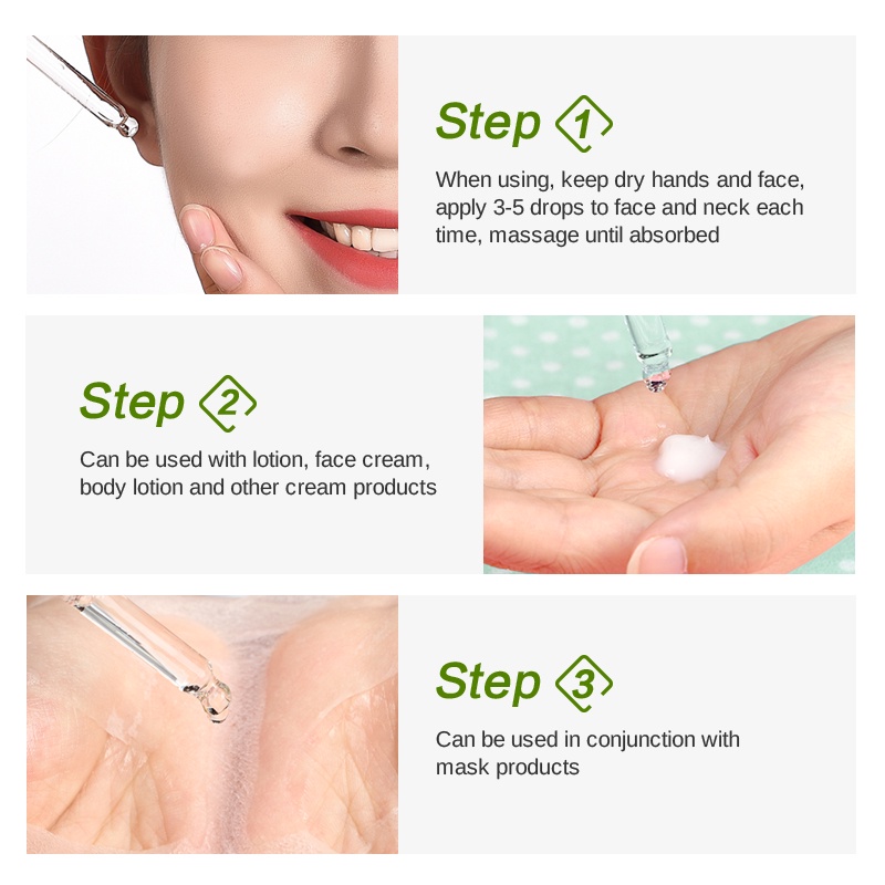 Hướng dẫn sử dụng Thoa một vài giọt tinh chất dưỡng da lên mặt buổi sáng và buổi tối như một phần của quy trình chăm sóc da của bạn. Tránh sử dụng quanh mắt. Sử dụng kem chống nắng vào buổi sáng.