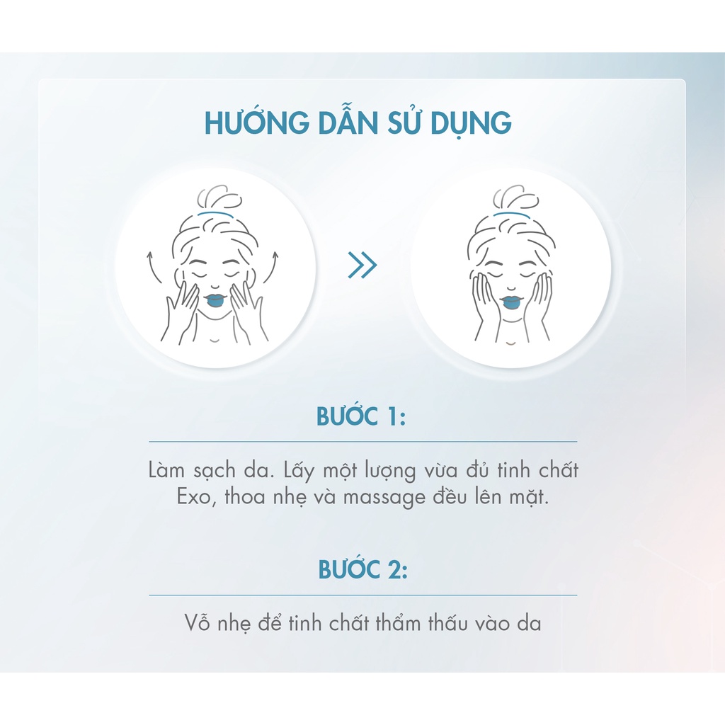Bước 1: Làm sạch da. Lấy một lượng vừa đủ tinh chất Exo, thoa nhẹ và Massage đều lên mặt. Bước 2: Vỗ nhẹ để tinh chất thẩm thấu vào da