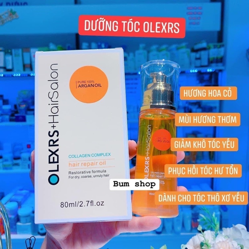 CÔNG DỤNG CỦA DẦU DƯỠNG TÓC PHỤC HỒI OLEXRS HAIR SALON - Dầu dưỡng tóc Olexrs là dạng tinh chất phục hồi tóc với chiết xuất chính từ dầu Argan - thành phần bí quyết tạo nên thương hiệu dưỡng tóc nổi tiếng. - Giúp phục hồi tóc hư tổn nặng, xơ, khô, chẻ ngọn, gãy rụng, hư tổn do nhuộm tóc, ép tóc, uốn tóc.... Giúp mọc tóc chắc khỏe, tóc sáng bóng, cân bằng độ ẩm, loại bỏ tĩnh điện, chống tia UV, hạn chế trẻ ngọn. - Dành cho tất cả loại tóc kể cả tóc khô, xơ và hư tổn.
