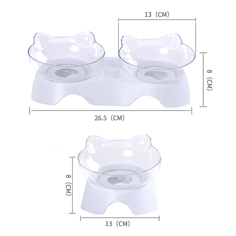 Description: 1. It is designed with a tilt of 15° to increase the base, so as to reduce the cervical vertebra compression caused by excessive lowering of the head when the pet eats, and to eat healthily. 2. Double bowl design with high base and cat ear design. 3.PC environmental protection material, fall resistant, safe and easy to clean. 4. Double bowl design, healthy diet: a set of tableware can provide water and food for dogs and cats at the same time. 5. Separation design: humanized separation design can clean the components one by one after disassembly. 6. Firm feet at bottom, anti-skid and mute.