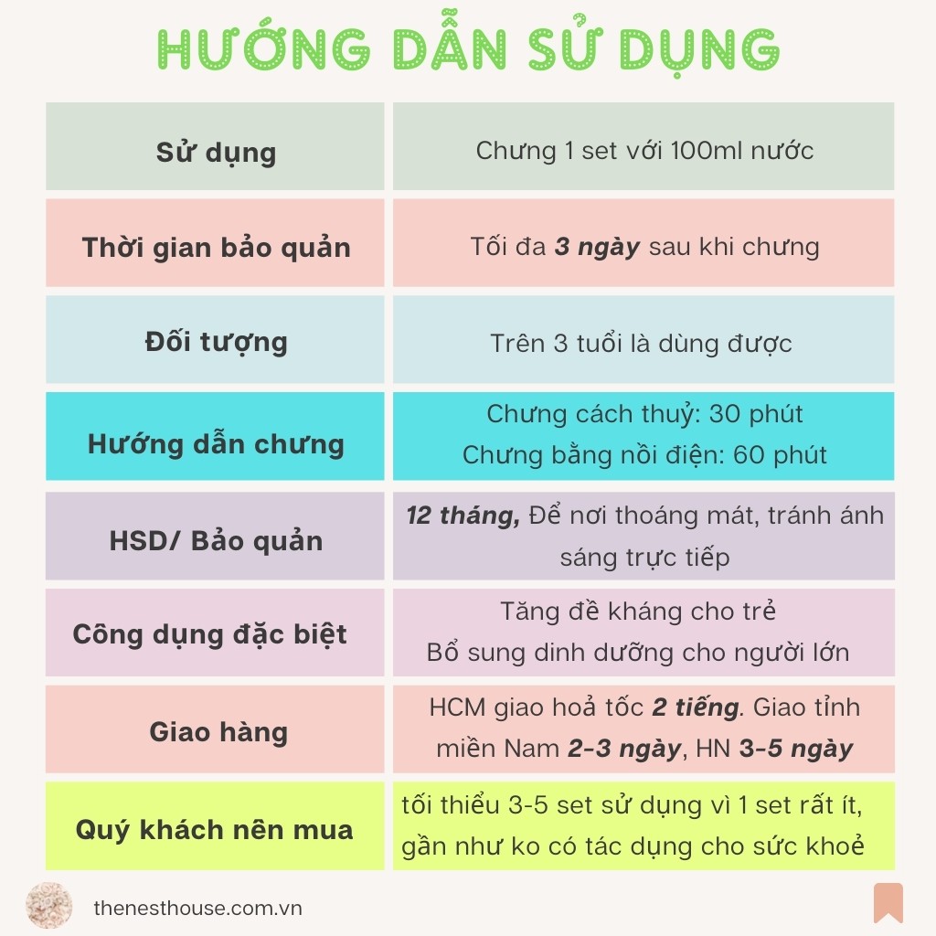👉 Hướng dẫn chưng: + Đối với set 3 gram tổ yến sợi cao cấp, The Nest House khuyên bạn nên sử dụng cho 1 lần ăn. + Sợi yến dòn dai, chưng rất nở và dôi. + Trẻ em dưới 6 tuổi nên chọn loại viên tròn để dễ sử dụng nhưng vẫn đảm bảo dinh dưỡng trong tổ yến.