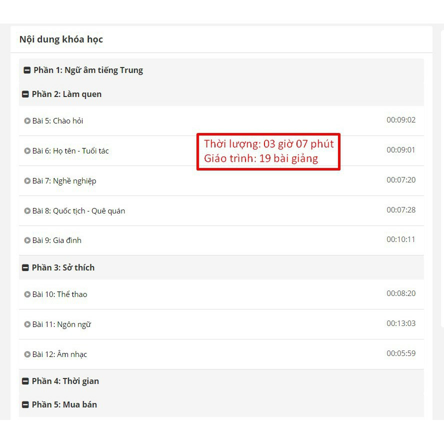 🔸 NỘI DUNG KHÓA HỌC Phần 1: Ngữ âm tiếng Trung Phần 2: Làm quen - Chào hỏi - Họ tên - Tuổi tác - Nghề nghiệp - Quốc tịch - Quê quán - Gia đình Phần 3: Sở thích - Thể thao - Ngôn ngữ - Âm nhạc Phần 4: Thời gian - Ngày lễ tết - Hỏi về giờ giấc - Bốn mùa - Dự báo thời tiết Phần 5: Mua bán - Đi siêu thị - Mua giày dép - Mua quần áo