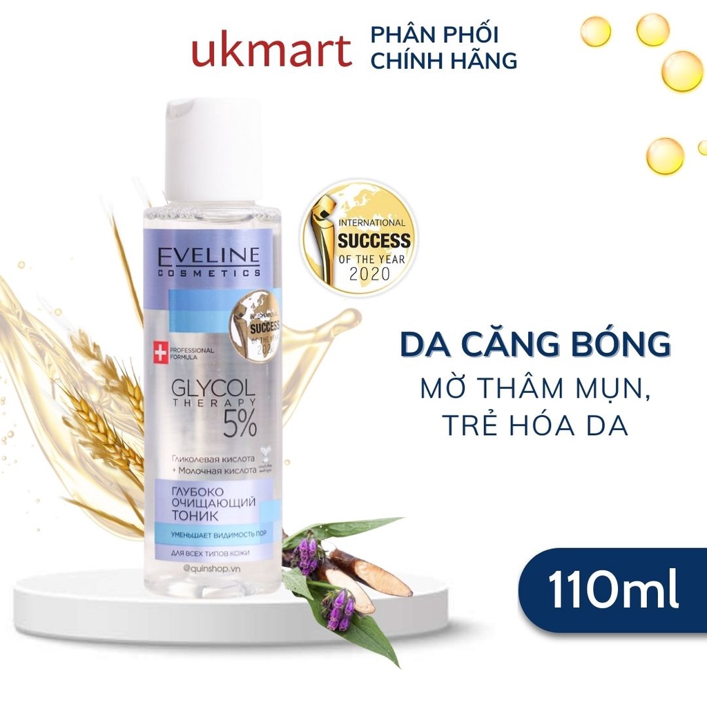 Toner Eveline 5% Glycolic Acid Glycol Therapy Cho Da Căng Bóng Mịn Màng Mờ Thâm Mụn Trẻ Hóa Da 𝗧𝗼𝗻𝗲𝗿 𝗘𝘃𝗲𝗹𝗶𝗻𝗲 𝗚𝗹𝘆𝗰𝗼𝗹 𝗧𝗵𝗲𝗿𝗮𝗽𝘆 𝟱%: Với 5% axit AHA làm sạch hiệu quả và nâng tông da, tẩy tế bào chết nhẹ nhàng, làm se khít lỗ chân lông, giảm khiếm khuyết trên da, duy trì làn da đầy sức sống và rạng ngời. Đạt giải thưởng International Success Of The Year 2020 danh giá!